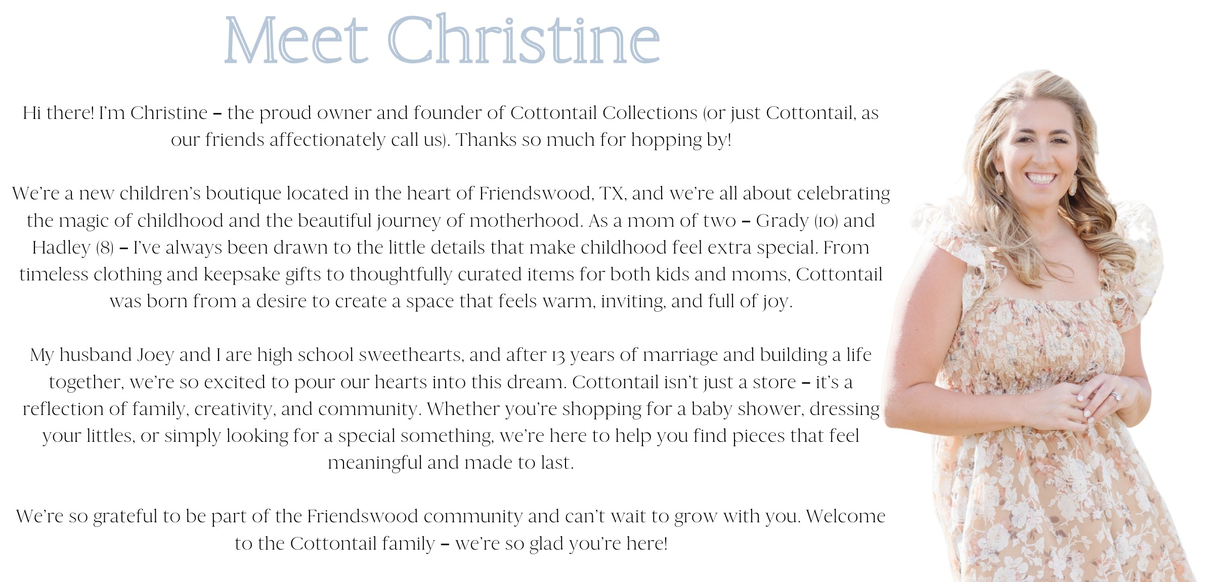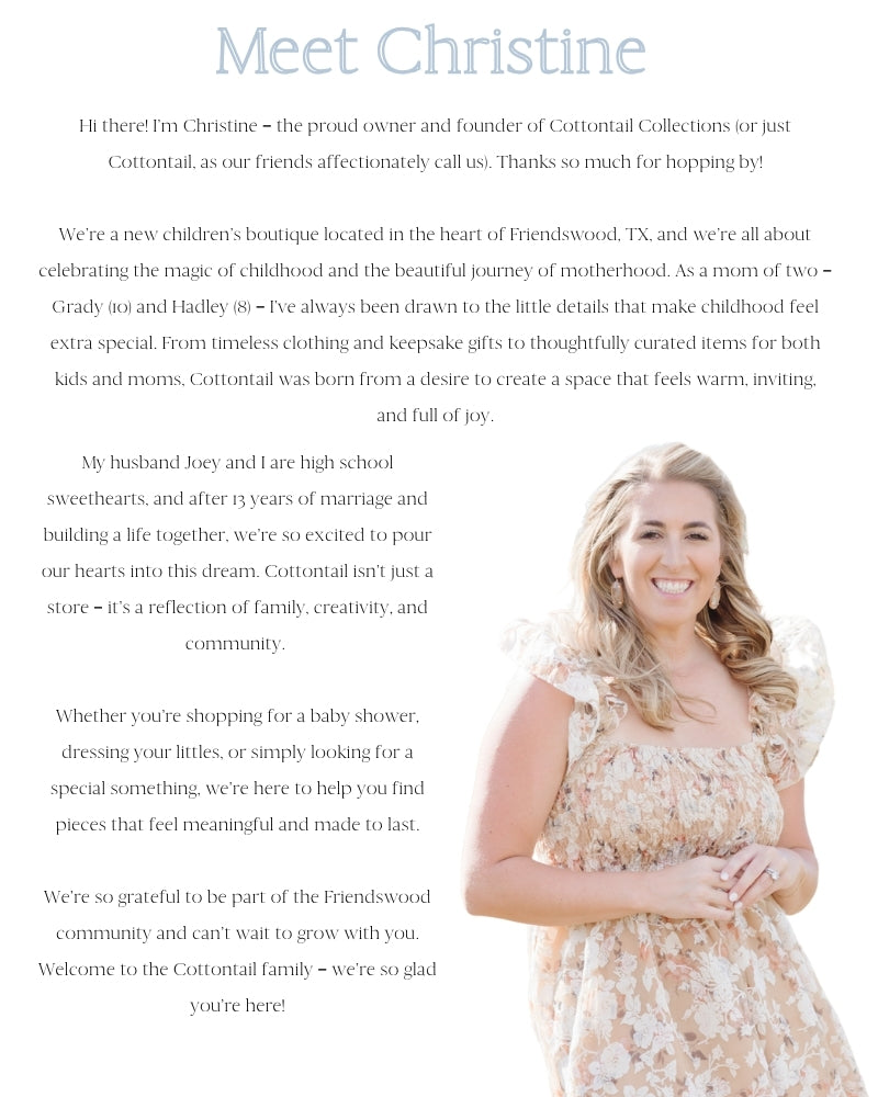 At Cottontail, we love what we do because we get to be part of the sweet, everyday moments that make childhood magical. From timeless clothing to thoughtful gifts, everything we offer is handpicked with love and inspired by the joys of motherhood and family life. Helping moms find something special, seeing little ones light up — it’s those connections that make this more than a boutique. It’s our passion, our purpose, and our way of building a community that feels like home.