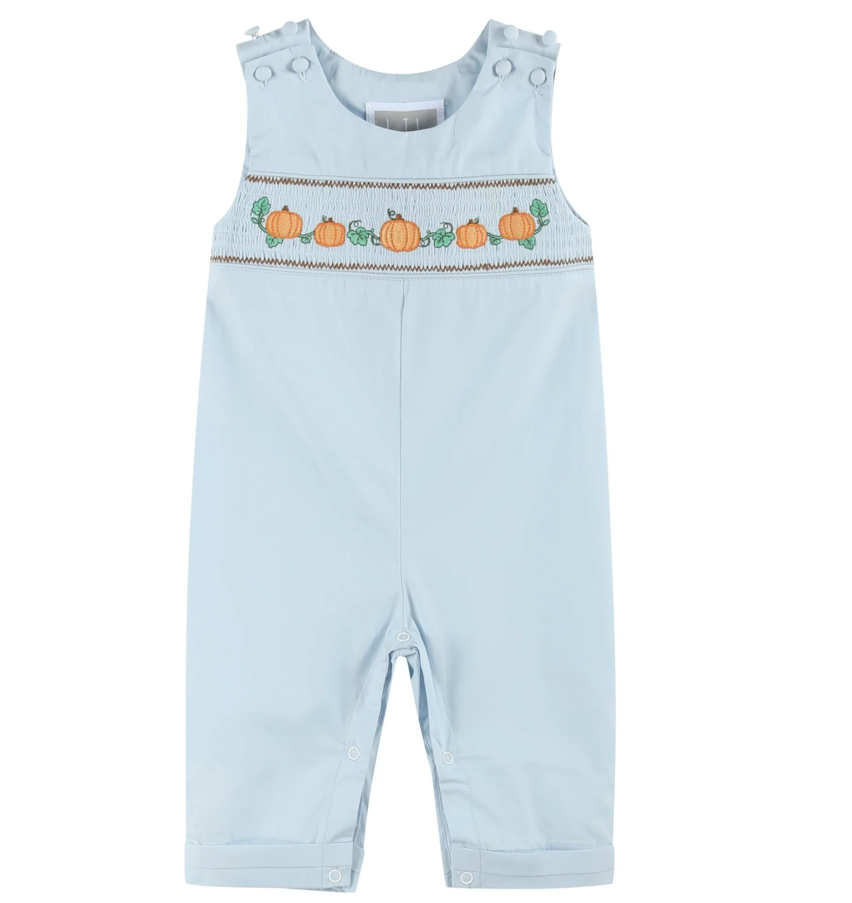 Dress your little one in cozy charm with the Blue Pumpkin Overalls. Featuring delightful smocking and embroidered pumpkins, these overalls capture the warmth of autumn. Adjustable shoulder buttons offer a comfortable fit, while convenient crotch snaps make diaper changes quick and easy. Ideal for festive outings and pumpkin patches, these overalls let your child celebrate the season in style and comfort.