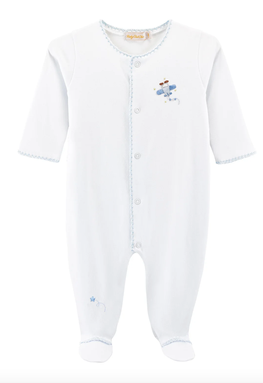 Elevate your little one's style with our Baby Club Chic Sky Adventure Footie. Made from soft pima cotton with a delicate blue crochet trim, this footie indulges in luxury. The charming airplane embroidery adds a touch of whimsy, making it perfect for your baby boy. Pamper your baby with this exclusive piece.
