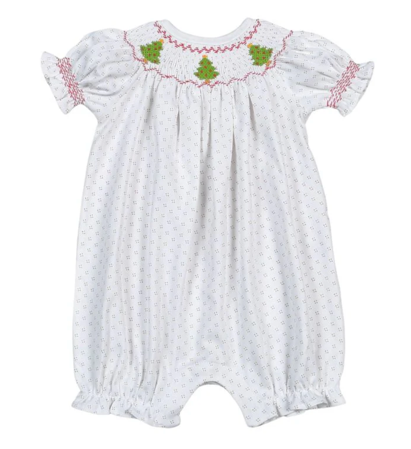 Dress your little one in festive charm with the Christmas Tree Bishop Bubble. Featuring a smocked bishop neckline adorned with delicate Christmas tree motifs, this piece combines holiday spirit with classic style. The playful dot print bubble pant adds a touch of whimsy and comfort, perfect for all-day wear during joyful celebrations. Designed to keep your child both stylish and comfortable, this outfit is an ideal choice for making holiday memories.