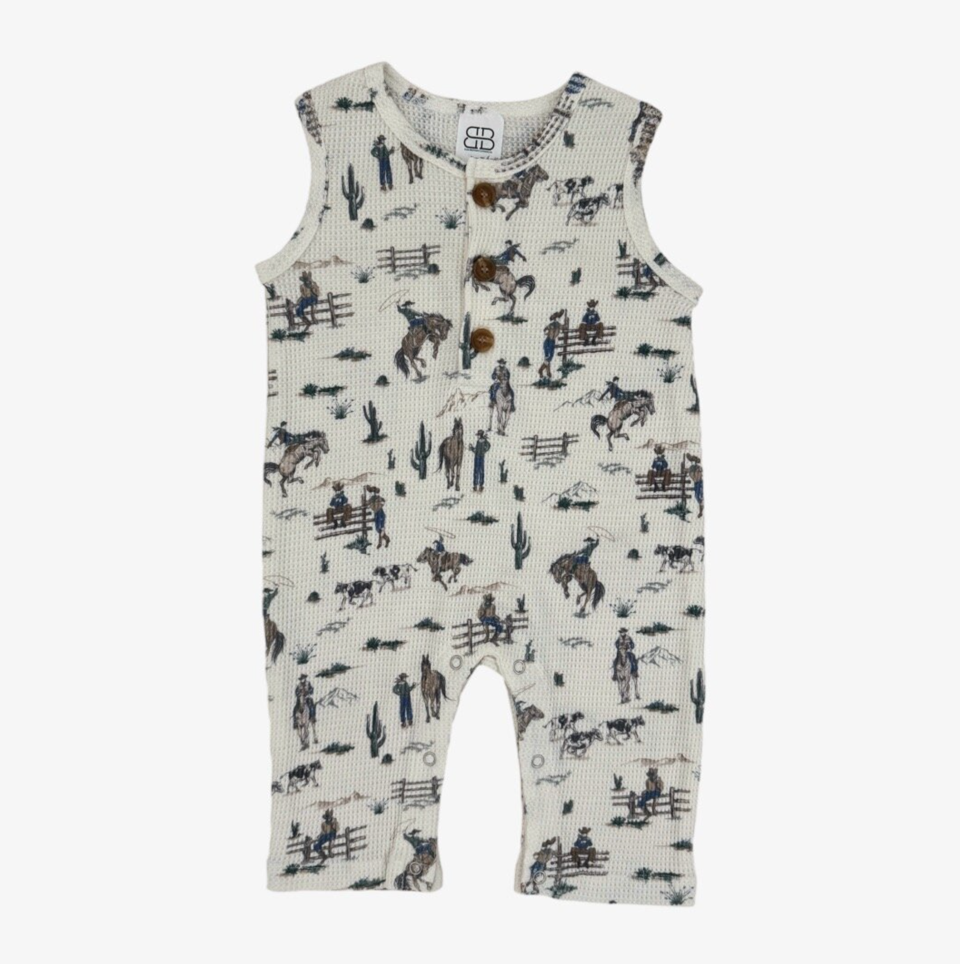 The Cruz Jumper in "The Ranch" print combines charming cowboy and horse motifs with cozy waffle knit fabric. Designed with convenient front buttons and metal snaps at the stride, it ensures easy dressing and diaper changes. Perfect for little adventurers, this jumper offers comfort and style inspired by the spirit of the ranch.