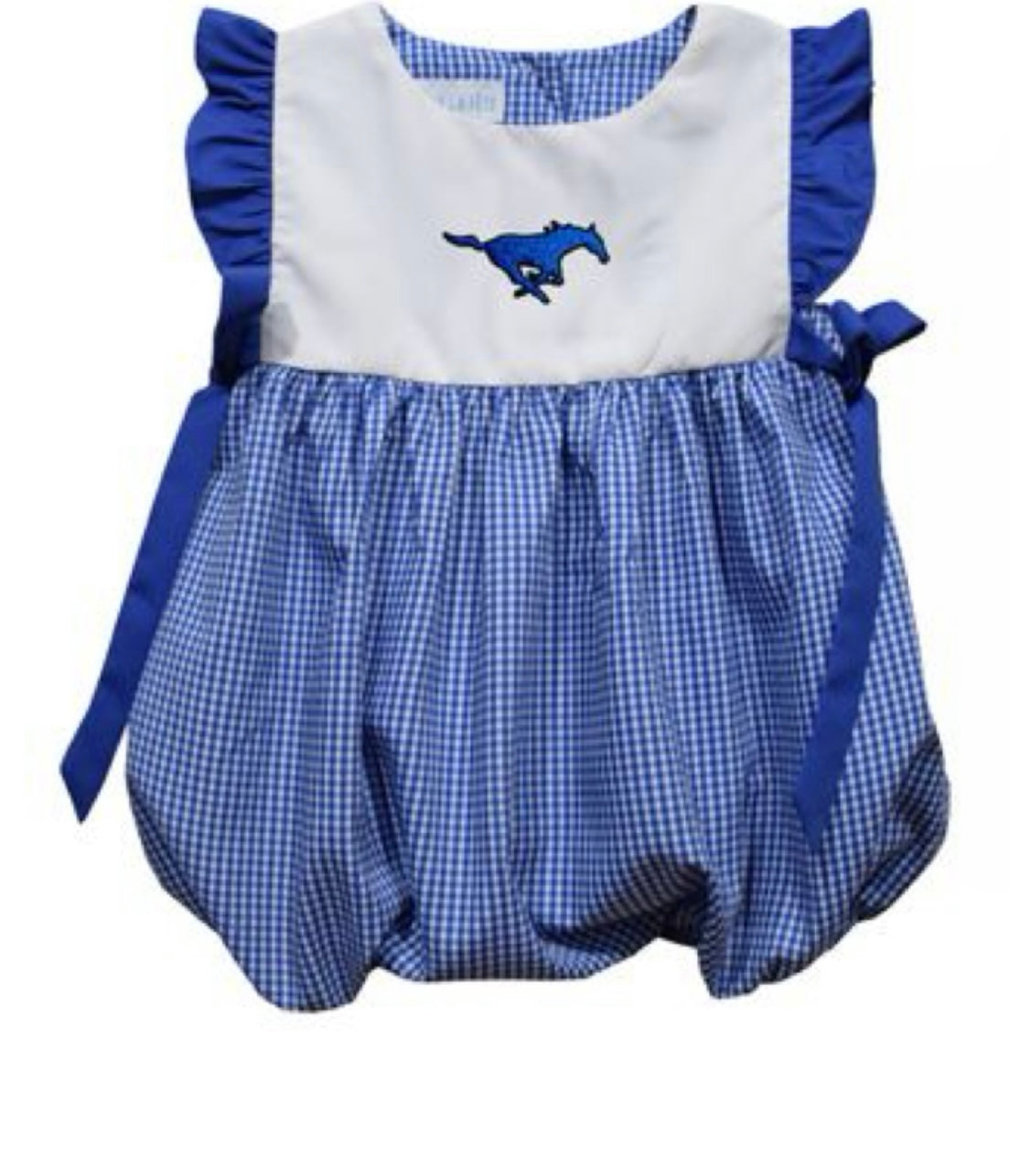 Dress your little one in style with the Friendswood High School Girls Bubble! This gingham royal blue bubble not only looks adorable with its mustang embroidery and ruffle sleeves, but also offers a comfortable fit with its side ties. Perfect for any occasion, your child will stand out in this charming outfit.