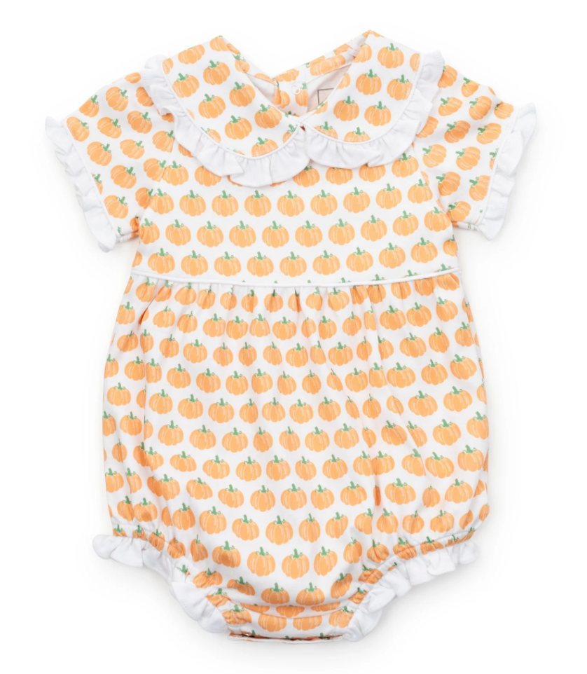This charming Harvest Pumpkin Council Bubble features a delicate ruffled Peter Pan collar and short sleeves, crafted from soft, breathable 100% Peruvian Pima cotton. Designed with a convenient button closure at the back and three snaps at the stride, it ensures easy dressing and diaper changes. Perfect for keeping your little one comfortable and stylish all day long.