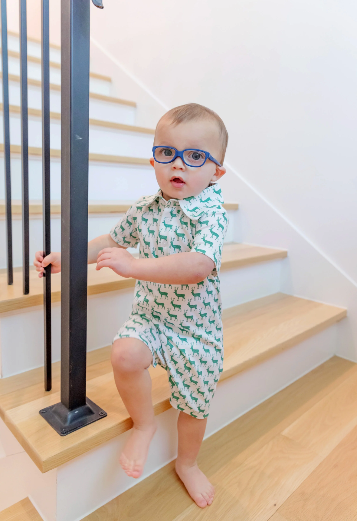 The Tripp Woodland Deer Shortall features a short-sleeve polo design with a button front and three snap closures in the stride for easy wear and secure fit. Made from 100% Peruvian cotton, it offers superior softness and breathability to keep your child comfortable all day. This shortall pairs perfectly with the Griffin golf shirt for older boys, creating a coordinated and polished look. Please note, this item is not intended for sleepwear. Ideal for stylish, everyday wear that keeps up with active little ones.