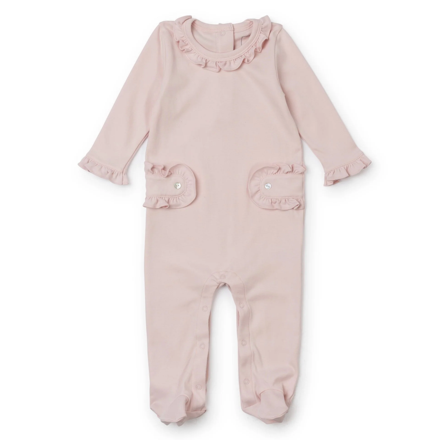 Wrap your little one in luxury with the Lucy Pima Romper, crafted from 100% Peruvian pima cotton for exceptional softness and breathability. This long-sleeved footed onesie features charming ruffles adorning the neck, collar, and side plackets for an adorable touch. Convenient snap closures at the stride and back of neck make diaper changes and dressing effortless. Perfect for cozy days and restful nights, this gentle romper is designed to keep your baby comfortable from