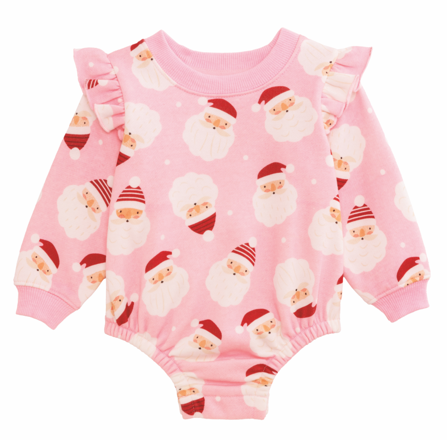 The Pink Santa Sweatshirt Bubble combines cozy comfort with festive charm, perfect for your baby aged 3-6 months. Made from soft brushed French terry fabric with a durable 58% cotton and 42% polyester blend, it feels gentle on delicate skin while ensuring breathability. Playful ruffle shoulders add a cute touch, while the cotton rib neckline and sleeve openings make dressing easy. Inner leg snaps provide quick diaper changes, making this sweatshirt both stylish and practical for cooler days. Keep your little one snug and adorable all season long.