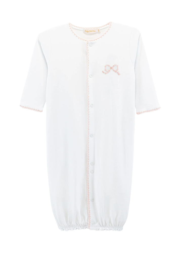 This precious gown features a pink embroidered bow and delicate crochet trim, making your little girl look even more adorable! Made with 100% Pima cotton, it's not only cute but also soft and comfortable for your baby. Give it as a gift or get one for your own little princess today!