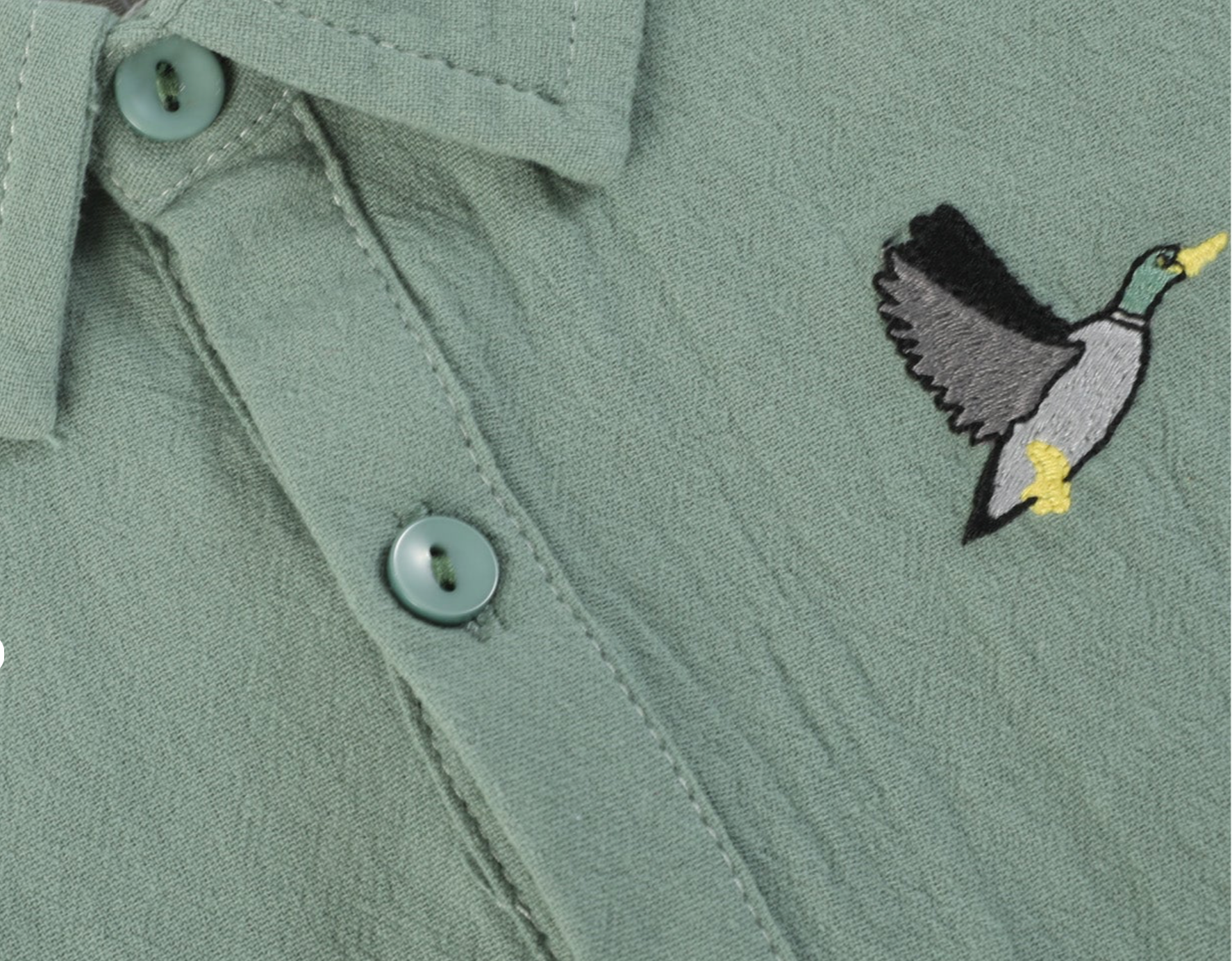 Elevate your little one's wardrobe with the Sage Mallard Boys Dress Shirt. This long sleeve button-up combines timeless style with a delightful embroidered mallard on the chest, offering a playful yet polished look. Crafted for comfort and charm, it’s the perfect choice for everything from family gatherings to special occasions. Dress him in confidence and cuteness all day long.