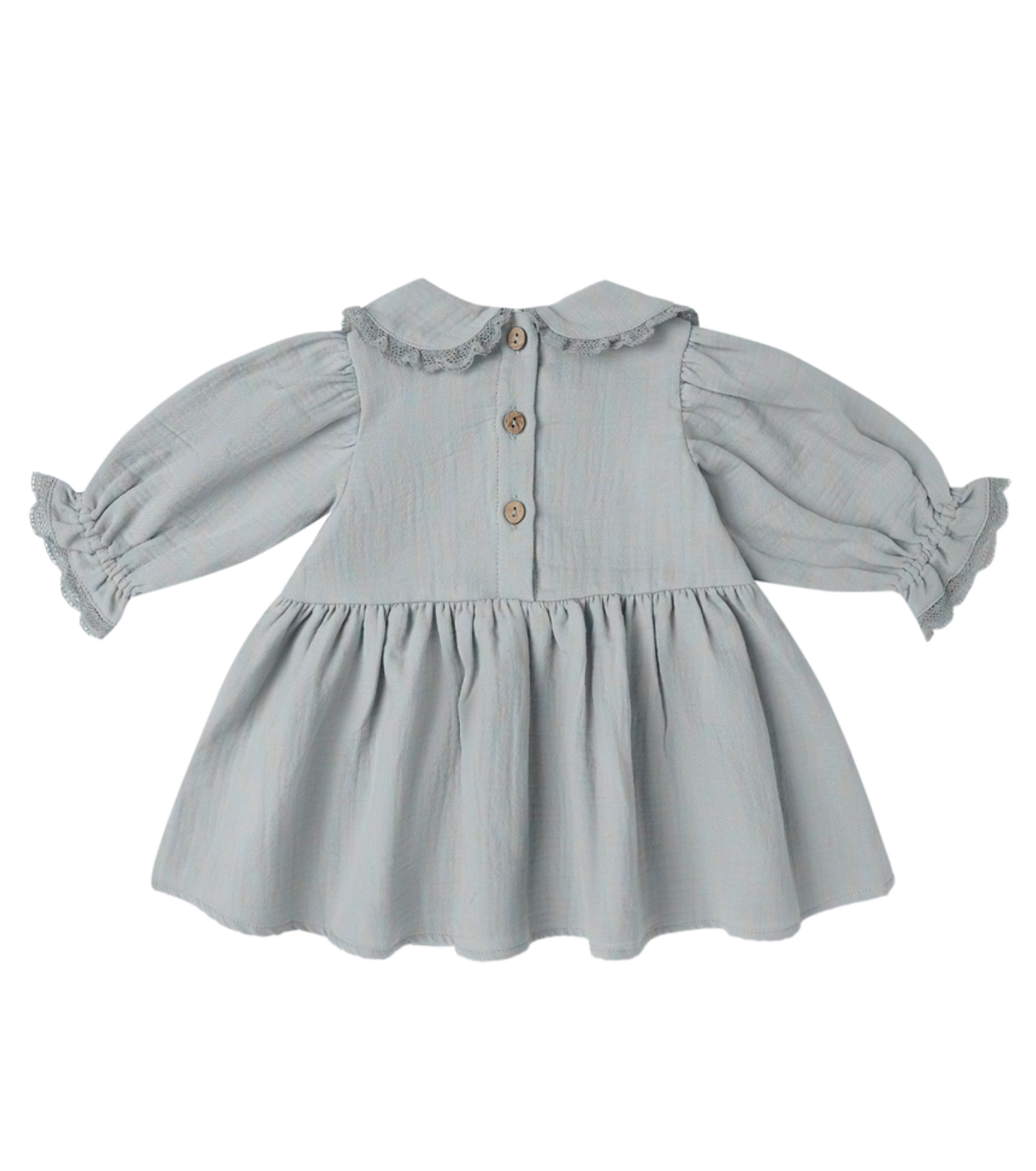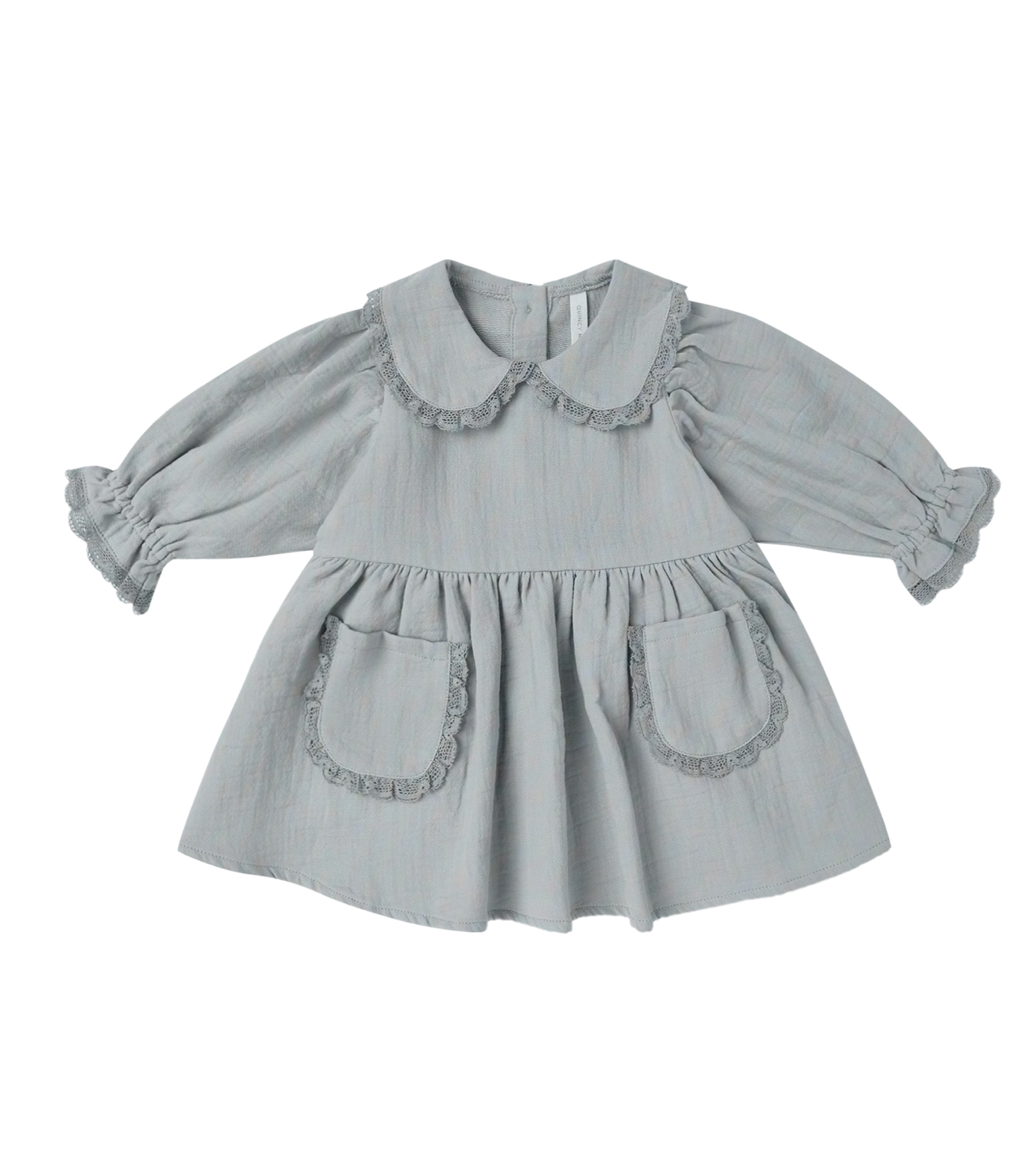Elevate your fall wardrobe with the Steele Blue Marisol Dress. In the perfect shade of blue, this dress features a peterman collar with delicate lace trim, two convenient front pockets, and stunning lace details on the wrist. Stay on-trend and stylish with this must-have dress!