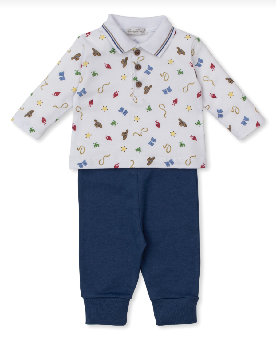 Step into timeless style with the Western Cowboy Pant Set, featuring a classic western print polo shirt paired with sleek navy blue pants. This ensemble combines rugged charm with modern comfort, perfect for making a confident statement at any casual or semi-formal occasion. Elevate your wardrobe with this versatile set that effortlessly blends tradition and contemporary fashion.