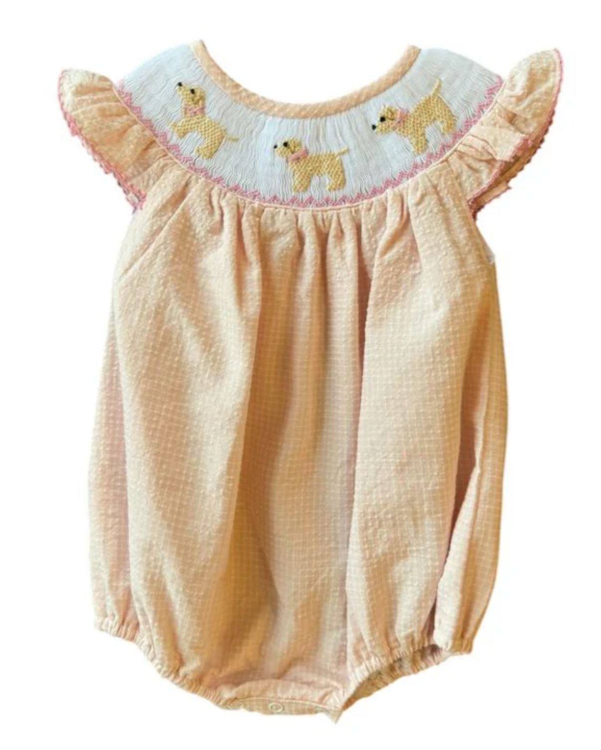 Dress your little one in charm and comfort with the Who Let the Dogs Out - Lila Bubble. Made from a soft, breathable blend of 65% polyester and 35% cotton, this lined bubble romper features delicate smocking adorned with adorable dog motifs on the collar, adding playful detail to a classic design. Perfect for keeping your child cozy and stylish during any occasion, it combines easy wearability with irresistible cuteness.